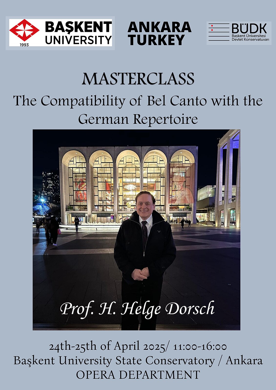 Unter dem Titel „Die Vereinbarkeit des Bel Canto mit dem deutschen Repertoire“ findet an der Başkent Universität in Ankara eine Meisterklasse mit Prof. H. Helge Dorsch statt. Die Veranstaltung läuft am 24. und 25. April 2025 von 11:00 bis 16:00 Uhr auf der Bühne des Başkent University State Conservatory.